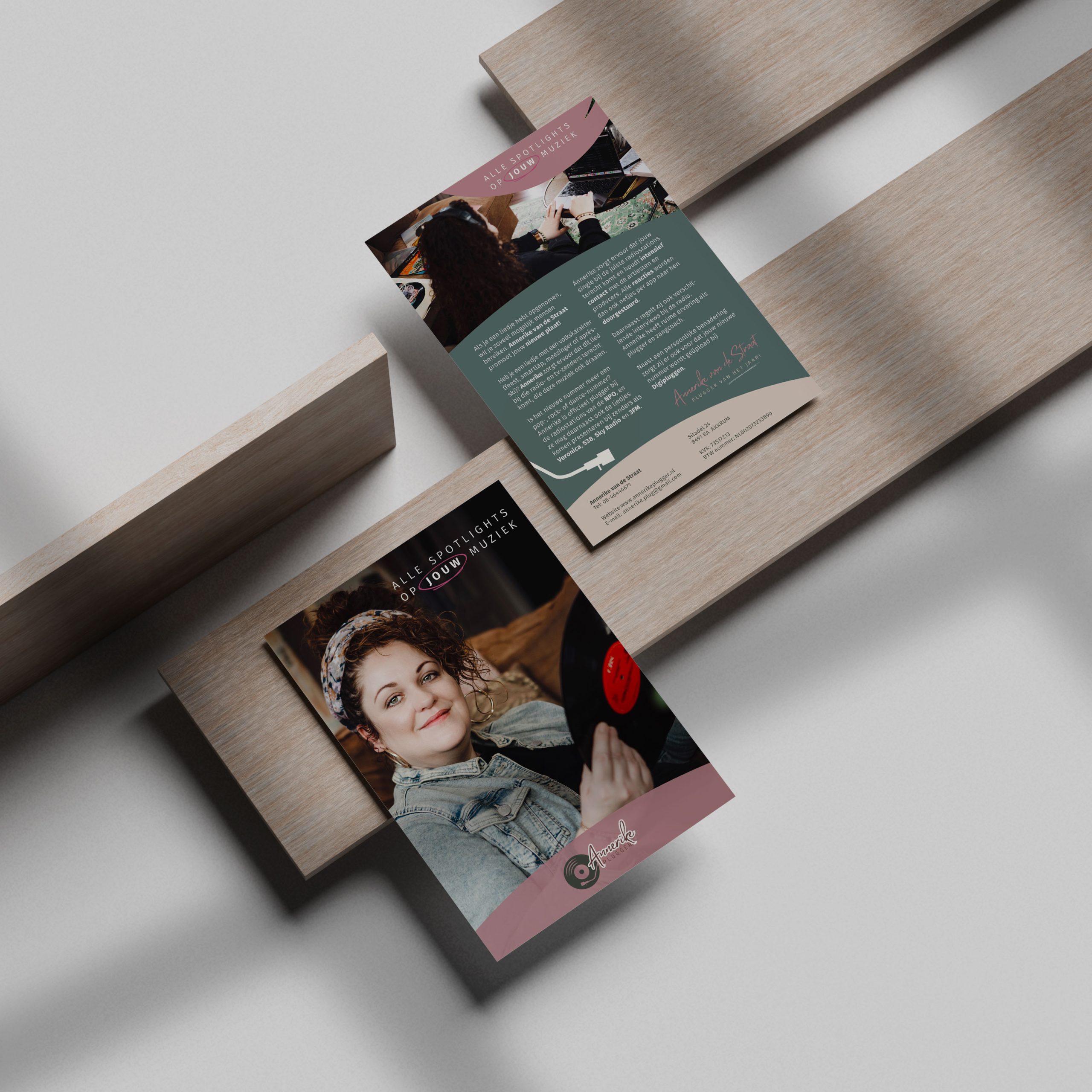Nadat ik het logo en de website voor muziekplugger Annerike van de Straat had ontworpen, kreeg ik opdracht een flyer vorm te geven en het drukwerk te verzorgen.
