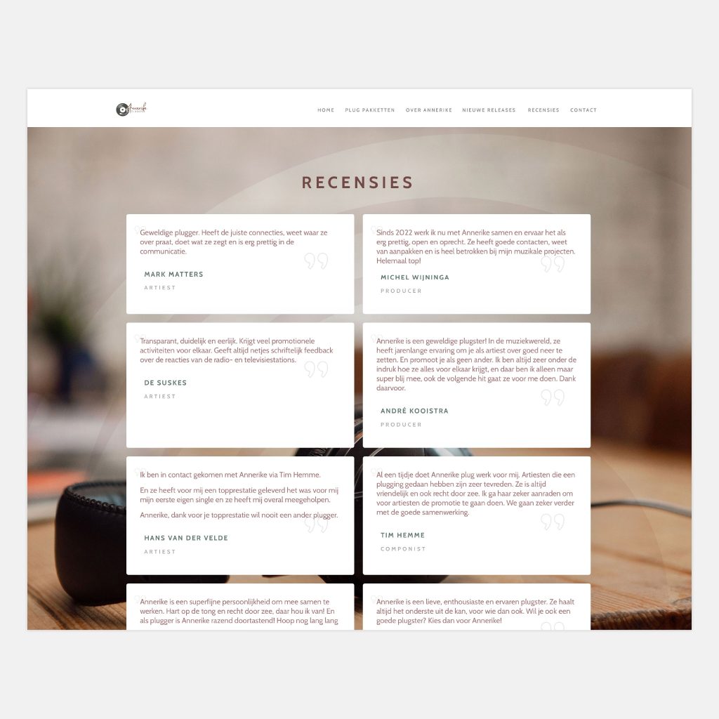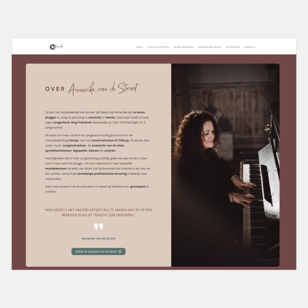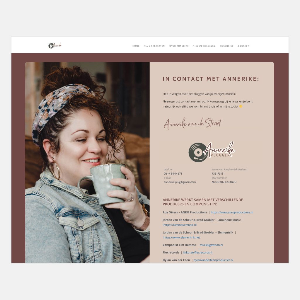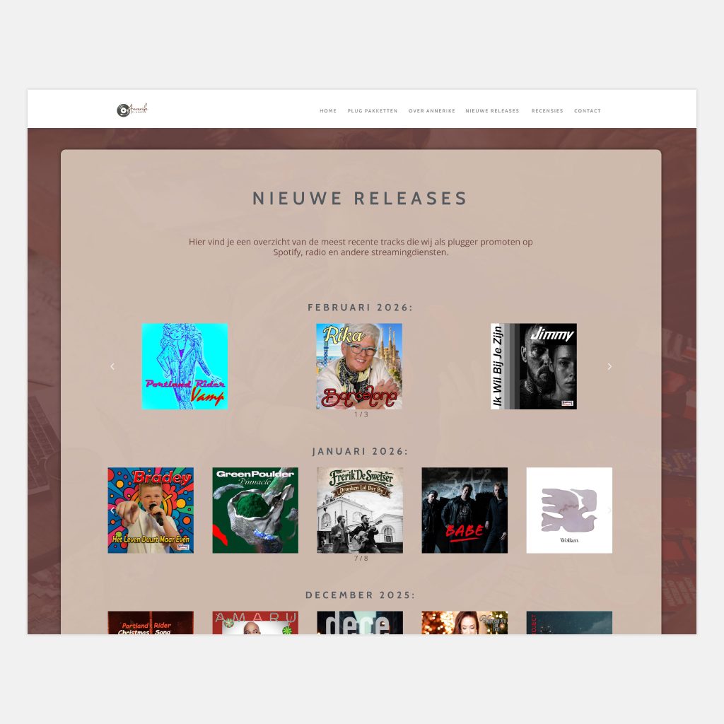 Voor muziekplugger Annerike van de Straat verzorgde ik het design en de bouw van haar website. Op de site worden onder meer alle nieuwe releases vermeld.