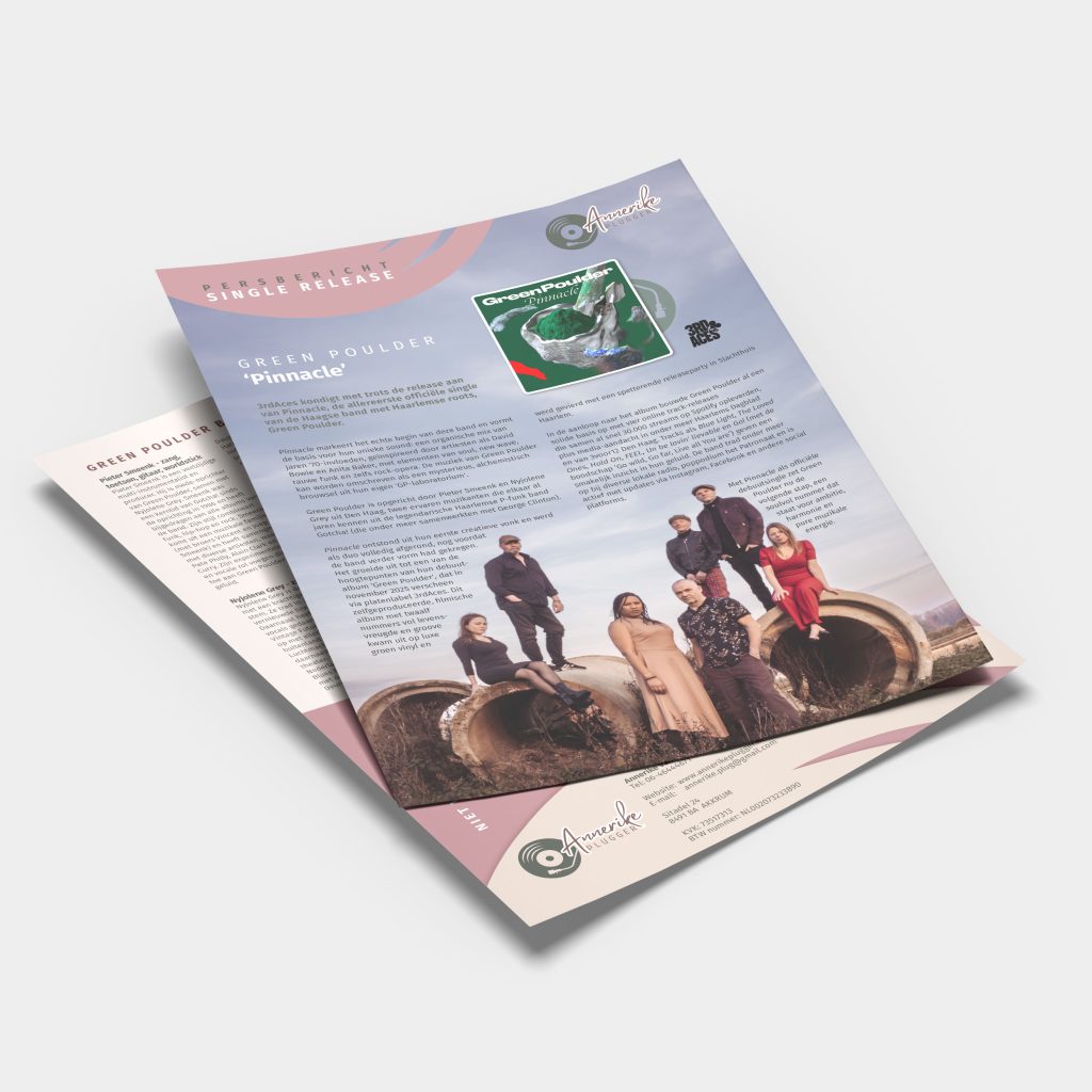 Muziekplugger Annerike van de Straat levert bij iedere promotieklus een persbericht van de artiest die haar inschakelt om hun nieuwe album of single te promoten. En ik verzorg de vormgeving hiervan en maak van ieder persbericht / biografie een ontwerp op maat.