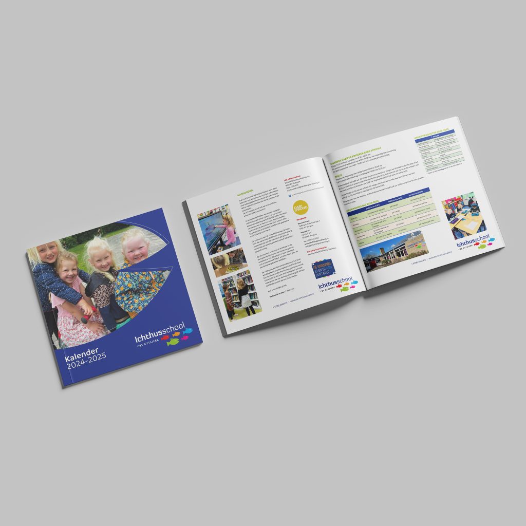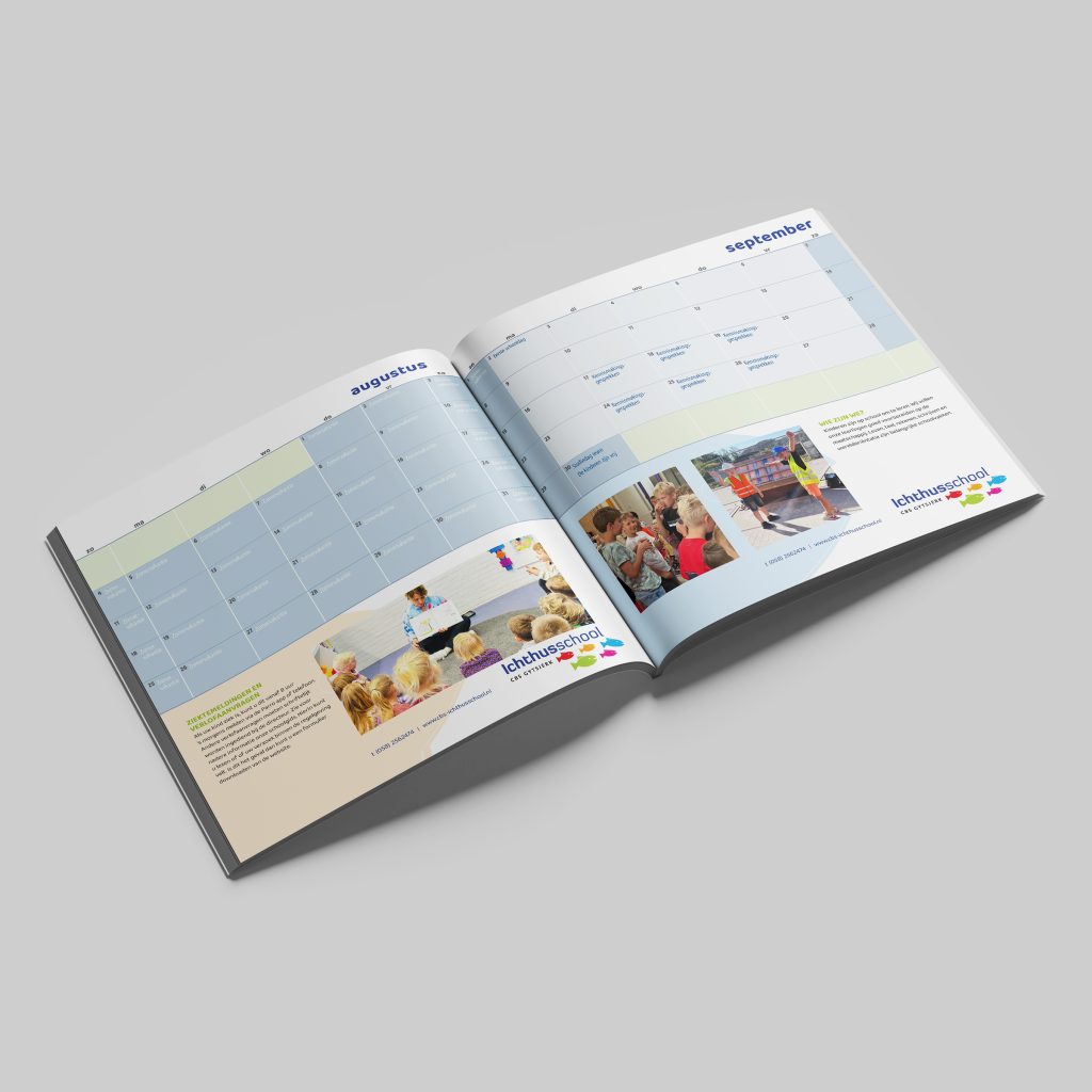 Iedere kalender van elke afzonderlijke school heeft zijn eigen, unieke vormgeving met huisstijlkleuren en grafische elementen.